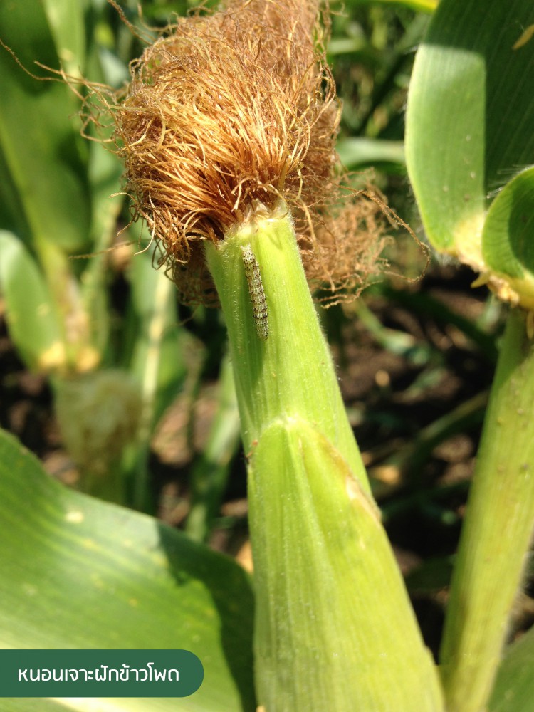 นอกจากนี้ ให้เฝ้าระวังหนอนเจาะฝักข้าวโพด โดยแม่ผีเสื้อจะวางไข่เป็นฟองเดี่ยว ๆ ตามเส้นไหมที่ปลายฝักข้าวโพดหรือที่ช่อดอกตัวผู้ หนอนกัดกินที่ช่อดอก และเมื่อเริ่มติดฝักตัวหนอนจะกัดกินเส้นไหมของฝัก และเจาะเข้าไปกัดกินอยู่ภายในบริเวณปลายฝัก ทำความเสียหายให้แก่คุณภาพฝักโดยตรง เนื่องจากปลายฝักเสียหาย และถ้าพบระบาดมากปลายฝักจะเน่า เนื่องจากความชื้นจากมูลของหนอนที่ถ่ายไว้ ซึ่งหนอนเจาะฝักข้าวโพดทำความเสียหายได้มากเมื่อเกิดการระบาดก่อนที่ขบวนการผสมเกสรจะเกิดขึ้น หากการระบาดรุนแรงจะทำให้เก็บผลผลิตไม่ได้ เนื่องจากหนอนกัดกินเส้นไหมจนแหว่งหมดไป ทำให้ข้าวโพดไม่ได้รับการผสมพันธุ์ ฝักที่ได้จึงไม่ติดเมล็ด หรือเกิดเป็นข้าวโพดฟันหลอขึ้น
