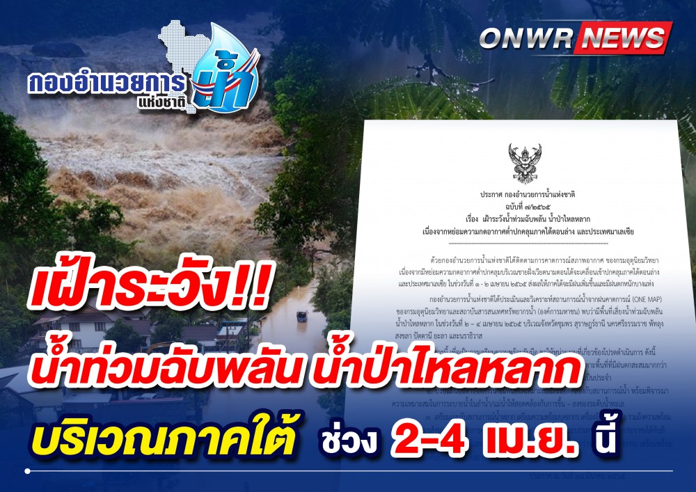 กองอำนวยการน้ำแห่งชาติได้ประเมินและวิเคราะห์สถานการณ์น้ำจากฝนคาดการณ์ (ONE MAP) ของกรมอุตุนิยมวิทยาและสถาบันสารสนเทศทรัพยากรน้ำ (องค์การมหาชน) พบว่า มีพื้นที่เสี่ยงน้ำท่วมฉับพลัน น้ำป่าไหลหลาก ในช่วงวันที่ 2 – 4 เมษายน 2565 บริเวณจังหวัดชุมพร สุราษฎร์ธานี นครศรีธรรมราช พัทลุง สงขลา ปัตตานี ยะลา และนราธิวาส