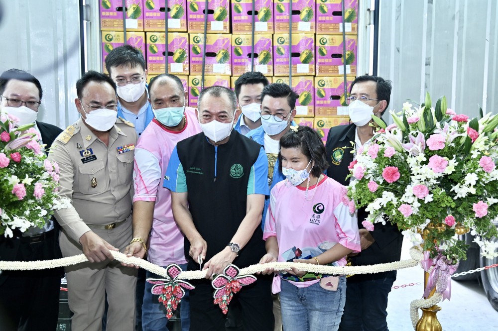 โอกาสนี้ รมว.เกษตรฯ และคณะ ได้เยี่ยมชมขั้นตอนการคัดบรรจุทุเรียน ตลอดจนขั้นตอนการขนส่งทุเรียนผ่านรถห้องเย็น (Cold Chain) ซึ่งจะต้องมีการพ่นฆ่าเชื้อ ทำความสะอาดทุกกระบวนการอย่างเคร่งครัด
