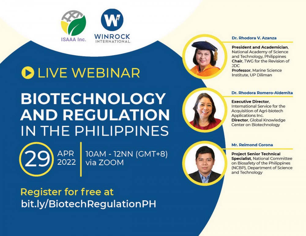 องค์การ ISAAA ร่วมกับ Winrock International ผ่านโครงการ Boosting Food Safety in the Philippines (B-SAFE) จะจัดสัมมนาออนไลน์เรื่อง เทคโนโลยีชีวภาพและการกำกับดูแลในฟิลิปปินส์ในวันที่ 29 เมษายน 2565เวลา 10.00 น. (GMT) +8). ขณะนี้ได้เปิดให้ลงทะเบียนสำหรับผู้สนใจได้เข้าร่วมแล้ว