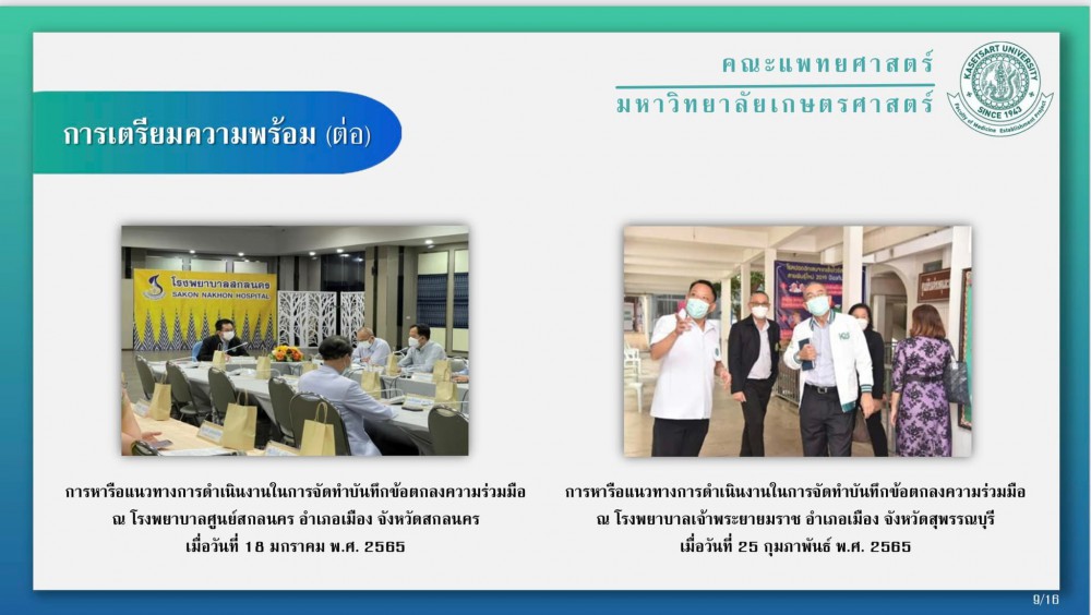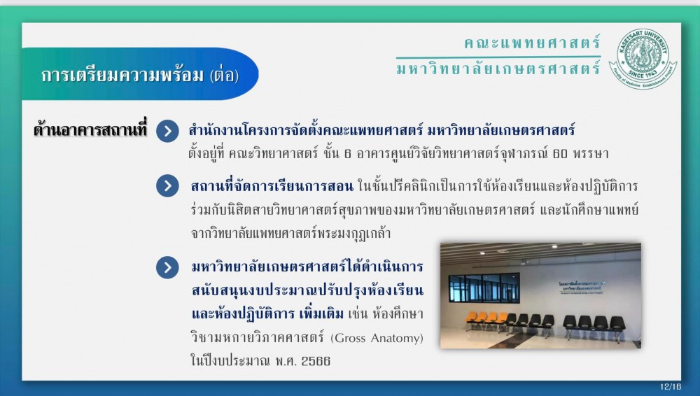 สรุปการดำเนินงาน 1.ใช้ชั้น 6-7 อาคารศูนย์วิจัยวิทยาศาสตร์จุฬาภรณ์ 60 พรรษา (อาคารใหม่) คณะวิทยาศาสตร์ เป็นที่ตั้งสำนักงาน ส่วนห้องเรียนต่าง ๆใช้ร่วมกับนิสิตสายวิทยาศาสตร์สุขภาพของ มก. และนักศึกษาแพทย์จากวิทยาลัยแพทยศาสตร์พระมงกุฎเกล้าที่ฝากเรียนกับ มก.,2.หลักสูตรแพทยศาสตร์ มก. เน้นอัตลักษณ์ เวชศาสตร์การเกษตรและชีวนวัตกรรม (Agro-Medicine and Bio-Innovation) ที่เชื่อมโยงความรู้ขั้นสูงด้านการเกษตร อาหาร ป่าไม้ สิ่งแวดล้อม ไปสู่การแพทย์ เป็นแห่งแรกของประเทศไทย และเอเชีย คาดว่าจะเสร็จเดือน มิถุนายน 2565 (เร็วกว่ากำหนดเดิม 2 เดือน)