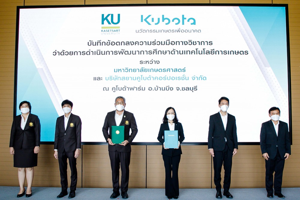 นางวราภรณ์ โอสถาพันธุ์ กรรมการรองผู้จัดการใหญ่อาวุโส บริษัทสยามคูโบต้าคอร์ปอเรชั่น จำกัด พร้อมด้วย นายรัชกฤต สงวนชีวิน ผู้จัดการฝ่าย Business Value Creation ร่วมลงนามบันทึกข้อตกลงความร่