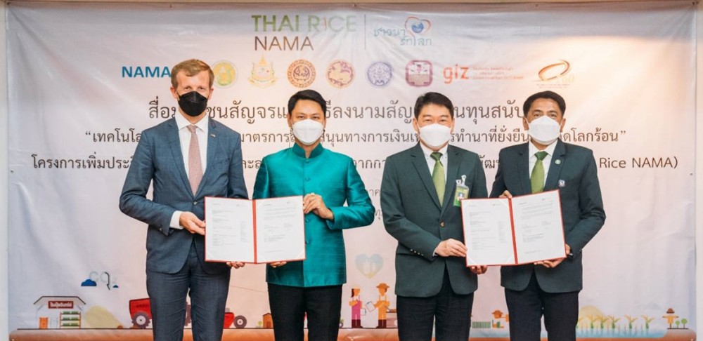 ล่าสุดเมื่อวันที่ 5 พฤษภาคม 2565 ผู้แทนจากโครงการฯ ประกอบด้วย (ในรูปจากซ้าย) นายไรน์โฮลด์ เอลเกส ผู้อำนวยกา GIZ ประจำประเทศไทย และมาเลเซีย นายกฤต อุตตมะเวทิน รองอธิบดีกรมการข้าว นายวิศิษฐ์ ศรีสุวรรณ์ ผู้แทนกรมส่งเสริมสหกรณ์ กรรมการ ธ.ก.ส. และนายพงษ์พันธ์ จงรักษ์ ผู้ช่วยผู้จัดการ ธ.ก.ส. ลงนามข้อตกลงร่วมกันที่ศูนย์วิจัยข้าวปทุมธานี อำเภอธัญบุรี จังหวัดปทุมธานี เพื่อร่วมกันขับเคลื่อนมาตรการสนับสนุนให้เกษตรกรผู้ปลูกข้าวรายย่อยสามารถเข้าถึงเทคนิคการทำนาลดโลกร้อน อย่างเป็นรูปธรรมในประเทศไทย