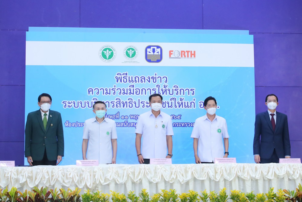 โดยมีนายแพทย์ธเรศกรัษนัยรวิวงค์ อธิบดีกรมสนับสนุนบริการสุขภาพ นายธนารัตน์ งามวลัยรัตน์ ผู้จัดการธ.ก.ส.และนายพงษ์ชัย อมตานนท์ ประธานกรรมการบริหาร บริษัท ฟอร์ท สมาร์ท เซอร์วิส จำกัด (มหาชน)ร่วมแถลงข่าวเมื่อวันที่ 11 พฤษภาคม2565ณ กรมสนับสนุนบริการสุขภาพกระทรวงสาธารณสุข จังหวัดนนทบุรี