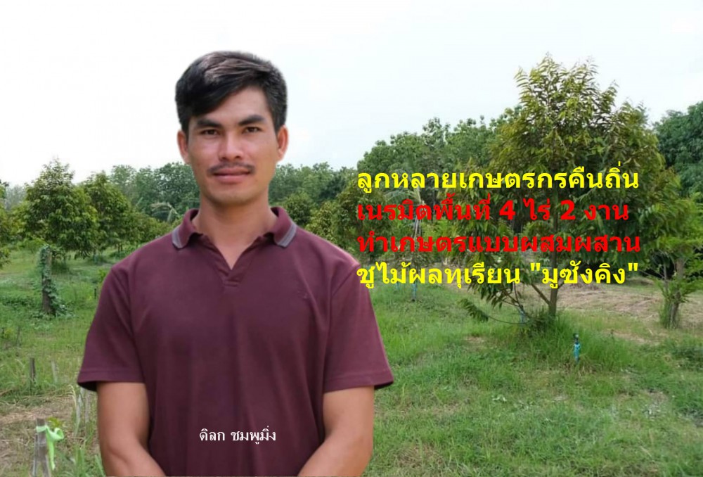 รองอธิบดีกรมส่งเสริมสหกรณ์ “อัชฌา สุวรรณนิตย์” นำทีมลุวนเกษตรผสมผสาน ของเกษตรกรรุ่นใหม่วัย 31 ปี “ดิลก ชมพูมิ่ง” หนึ่งในเกษตรกร ที่ร่วม “โครงการนำลูกหลานเกษตรกรกลับบ้าน สานต่ออาชีพการเกษตร” เนรมิตเนื้อที่ 4 ไร่ 2 งานที่บ้านแม่คำมี อ.หนองม่วงไข่ จ.แพร่ มาทำเป็นสวนเกษตรผสมผสาน เน้นพืชเศรษฐกิจที่สร้างรายได้ ชูโรงทุเรียนพันธุ์มูซังคิง และไผ่กิมซุง ตั้งเป้าจะสร้างได้ปีละ 4 ล้านบาท