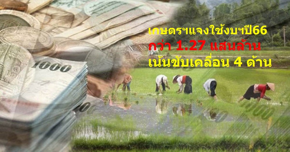 กระทรวงเกษตรฯจัดแจงใช้งบฯ ปี 2566 กว่า 1.27 แสนล้าน เพิ่มขึ้นจากปีที่แล้ว 15 % เน้น 4 ด้าน ให้ความสำคัญด้านการสร้างการเติบโตบนคุณภาพชีวิตที่เป็นมิตรต่อสิ่งแวดล้อมกว่า 8 หมื่นล้าน ตามด้วยการสร้างความสามารถในการแข่งขัน 43,952.4636 ล้าน การสร้างโอกาสและความเสมอภาคทางสังคม 2,079.0006 ล้าน และด้านความมั่นคง 277.2521 ล้านบาท