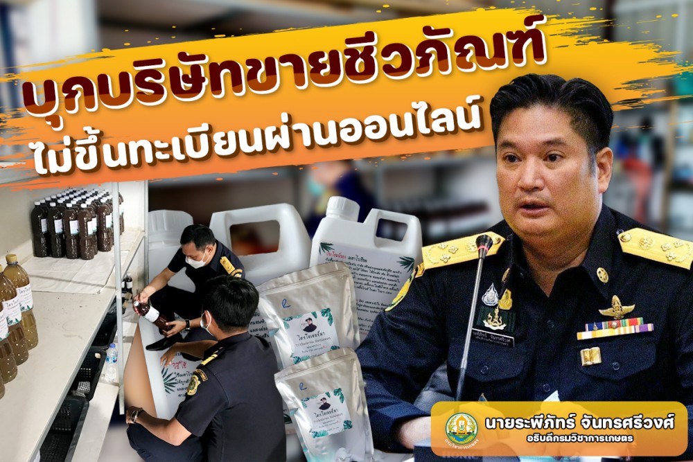 สารวัตรเกษตร กรมวิชาการเกษตร แท็กทีม ตำรวจ นำหมายค้นศาลบุกบริษัทขายเคมีเกษตรเมืองโคราช ใช้ช่องทางออนไลน์ขายชีวภัณฑ์ไม่ขึ้นทะเบียนและไม่แจ้งดำเนินการผลิต ผิด พ.ร.บ.วัตถุอันตราย อายัดผลิตภัณฑ์ต้องสงสัย 6 รายการ พร้อมยึดวัตถุดิบและอุปกรณ์การผลิตอีก 12 รายการ รวมมูลค่ากว่า 2 แสนบาท