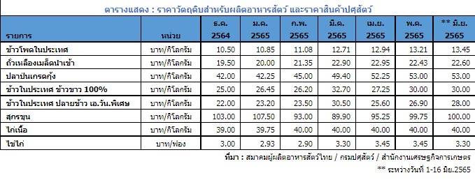 ความขัดแย้งกันของประเทศรัสเซีย-ยูเครน และการงดการส่งออกธัญพืชสำคัญของทั้งสองประเทศ เป็นปัจจัยผลักดันให้ราคาข้าวโพดเลี้ยงสัตว์สูงขึ้นอย่างต่อเนื่อง (ดังตารางข้างต้น) ส่งผลให้ราคาข้าวโพดเลี้ยงสัตว์เฉลี่ย 5 เดือนแรก อยู่ที่กิโลกรัมละ 12.16 บาท ทิศทางราคาข้าวโพดเลี้ยงสัตว์ยังเพิ่มสูงขึ้นอย่างต่อเนื่อง ราคาล่าสุดในเดือนมิถุนายนอยู่ที่กิโลกรัมละ 13.45 บาท นับเป็นราคาที่สูงขึ้นเป็นประวัติการณ์ และมีแนวโน้มขยับสูงขึ้นต่อเนื่อง