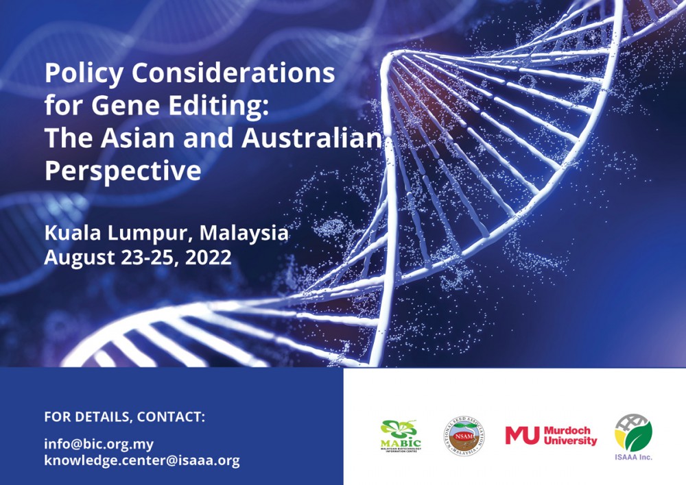 องค์การ ISAAA Inc. ร่วมกับ BioTrust Global, ศูนย์ข้อมูลเทคโนโลยีชีวภาพมาเลเซีย (Malaysian Biotechnology Information Center, Murdoch University และสมาคมเมล็ดพันธุ์แห่งชาติมาเลเซีย (National Seed Association Malaysia) จะจัดการประชุมเชิงปฏิบัติการข้อควรพิจารณาด้านนโยบายสำหรับการแก้ไขยีน : มุมมองของเอเชียและออสเตรเลีย (Policy Considerations for Gene Editing: The Asian and Australian Perspective) ตั้งแต่วันที่ 23 ถึง 25 สิงหาคม พ.ศ. 2565 ที่กรุงกัวลาลัมเปอร์ ประเทศมาเลเซีย