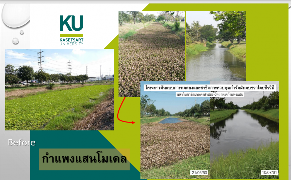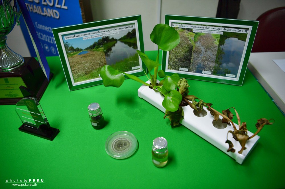 สำหรับผลงานวิจัยที่นำมาใช้ในการกำจัดผักตบชวา นั้น มีชื่อว่า KPS: Selective bioherbicide” to control water hyacinth in Thailand (เคพีเอส ชีวภัณฑ์กำจัดวัชพืชแบบเลือกทำลายเพื่อควบคุมผักตบชวา) เป็นผลงานของ รศ. ดร. จินตนา อันอาตม์งาม หัวหน้าภาควิชาโรคพืช คณะเกษตร กำแพงแสน และ อ.ดร.อาร์ม อันอาตม์งาม หัวหน้าศูนย์ส่งเสริมการวิจัยและถ่ายทอดเทคโนโลยี คณะศิลปศาสตร์และวิทยาศาสตร์ มหาวิทยาลัยเกษตรศาสตร์ วิทยาเขตกำแพงแสน โดยผลงานเป็นที่ประจักษ์ที่ได้มีการทดสอบในพื้นที่จริงหลายแห่ง และได้รับรางวัลจากการประกวดผลงานวิจัย สิ่งประดิษฐ์ และนวัตกรรม ในเวทีระดับชาติและนานาชาติ ได้แก่