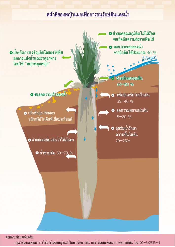 นางสาวเบญจพร ชาครานนท์ อธิบดีกรมพัฒนาที่ดิน เปิดเผยว่า กรมพัฒนาที่ดิน เป็นหน่วยงานดำเนินการ ศึกษาวิจัยและรณรงค์การใช้หญ้าแฝก โดยเฉพาะการปลูกหญ้าแฝกเพื่อการอนุรักษ์ดินและน้ำตามแนวพระราชดำริ ป้องกันการชะล้างพังทลายของดิน จากการถูกกัดเซาะจากฝนที่ตกลงมา ทำให้แร่ธาตุและความสมบูรณ์ของดินถูกชะล้างไป อีกทั้งมีคุณสมบัติช่วยดักตะกอนดินและช่วยชะลอความเร็วของน้ำ ซึ่งหญ้าแฝกมีระบบรากยาว สานกันแน่น โอบดิน อุ้มน้ำ เป็นที่อาศัยของจุลินทรีย์ มีความคงทนสามารถอยู่ได้นานหลายปี
