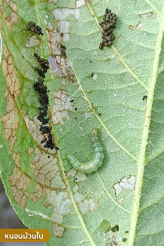 นอกจากนี้ ยังต้องเฝ้าระวังหนอนม้วนใบเข้าทำลายผลผลิตด้วย โดยหนอนม้วนใบที่ฟักออกจากไข่ ใหม่ ๆ จะอยู่รวมกันเป็นกลุ่ม ชักใยบาง ๆ คลุมตัวไว้ แล้วกัดกินผิวใบ เมื่อหนอนโตขึ้นจึงกระจายกันออกไปทั่วทั้งแปลง สร้างใยยึดใบพืชจากขอบใบของใบเดียวเข้าหากันหรือยึดใบมากกว่า 2 ใบเข้าหากันแล้วอาศัยกัดกินอยู่ในห่อใบนั้นจนหมดแล้วเคลื่อนย้ายไปทำลายใบอื่นต่อไป หากพบการระบาดให้พ่นสารฆ่าแมลง แลมบ์ดา-ไซฮาโลทริน 2.5% EC อัตรา 10 มิลลิลิตรต่อน้ำ 20 ลิตร หรือ ไตรอะโซฟอส 40% EC อัตรา 40 มิลลิลิตรต่อน้ำ 20 ลิตร พ่นเมื่อใบถูกทำลาย 30 เปอร์เซ็นต์ก่อนออกดอก