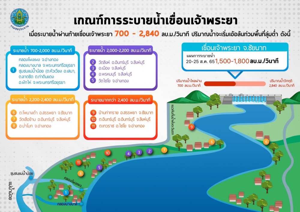 ดังนั้นกรมชลประทาน จำเป็นต้องทยอยปรับการระบายน้ำผ่านเขื่อนเจ้าพระยา ไปจนถึงอัตรา 1,500 ลบ.ม./วินาที เริ่มตั้งแต่วันนี้ (20 ส.ค. 65) เวลา 06.00 น. เป็นต้นไป และในช่วงวันที่ 23 – 25 ส.ค. 65 ปรับการระบายน้ำผ่านเขื่อนเจ้าพระยาในอัตรา 1,500 – 1,800 ลบ.ม./วินาที ส่งผลให้ระดับน้ำด้านท้ายเขื่อนเพิ่มสูงขึ้น ซึ่งอาจจะส่งผลกระทบต่อชุมชนบริเวณพื้นที่ลุ่มต่ำนอกคันกั้นน้ำ ดังนี้ คลองโผงเผง จ.อ่างทอง,คลองบางบาล จ.พระนครศรีอยุธยา, ที่ ต.หัวเวียง อ.เสนา ต.ลาดชิด ต.ท่าดินแดง อ.ผักไห่ จ.พระนครศรีอยุธยา (แม่น้ำน้อย)