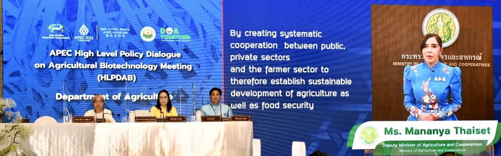 นางสาวมนัญญา กล่าวว่า การที่ไทยได้รับเกียรติเป็นเจ้าภาพจัดประชุมเอเปคในปี 2565 กระทรวงเกษตรและสหกรณ์เป็นเจ้าภาพจัดการประชุมรัฐมนตรีความมั่นคงอาหารเอเปค และการประชุมอื่นๆ ที่เกี่ยวข้อง อาทิ หุ้นส่วนเชิงนโยบายความมั่นคงอาหาร (PPFS) ความร่วมมือทางวิชาการด้านการเกษตร (ATCWG) โดยกรมวิชาการเกษตรเป็นเจ้าภาพจัดประชุม HLPDAB ซึ่งสอดคล้องกับนโยบายของประเทศไทย เรื่องการขับเคลื่อนการพัฒนาเศรษฐกิจด้วยโมเดลเศรษฐกิจ BCG เศรษฐกิจชีวภาพ (Bio Economy) เศรษฐกิจหมุนเวียน (Circular Economy) และเศรษฐกิจสีเขียว (Green Economy) ตลอดจนนำนโยบาย 3S ความปลอดภัย (Safety) มั่นคง (Security) และความยั่งยืน (Sustainability) มาปฏิรูปการเกษตรและระบบอาหาร ด้วยเทคโนโลยีชีวภาพด้านการเกษตร