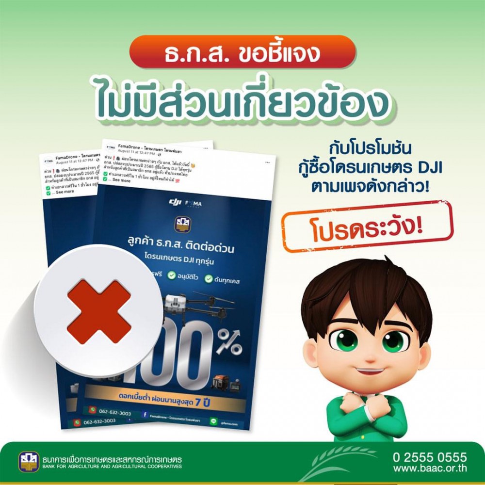 แอบอ้างอีกแล้ว ธ.ก.ส. ออกโรงเตือน!! อย่าหลงเชื่อเพจเฟสบุ๊ค “Fama Drone” ที่อ้างปล่อยกู้ และผ่อนโดรนเกษตรทุกรุ่นกับ ธ.ก.ส. ขอยืนยันธนาคารเพื่อการเกษตรฯไม่มีส่วนเกี่ยวข้องใดๆทั้งสิ้นถือเป็นการอแบอ้างมราไม่ถูกต้อง