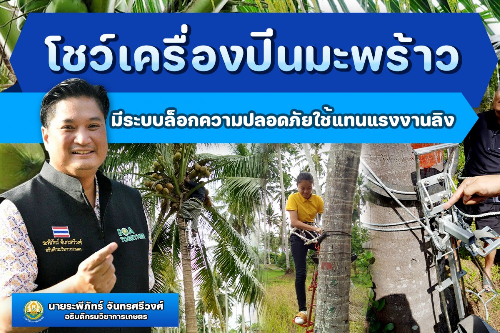 กรมวิชาการเกษตร วิจัยพัฒนาเครื่องปีนมะพร้าวตัวช่วยเก็บผลผลิตแทนใช้แรงงานลิง สร้างความมั่นใจ ไทยปลอดภัยกว่าต่างประเทศ ด้วยระบบเข็มขัดล็อกควบคุมความปลอดภัยระหว่างใช้งาน น้ำหนักชุดอุปกรณ์รวม 2 ข้างซ้ายและขวา 10 กิโลกรัม ปลื้มศักยภาพสามารถปีนขึ้นลงต้นมะพร้าวด้วยความเร็วเพียง 0.14 เมตรต่อวินาที