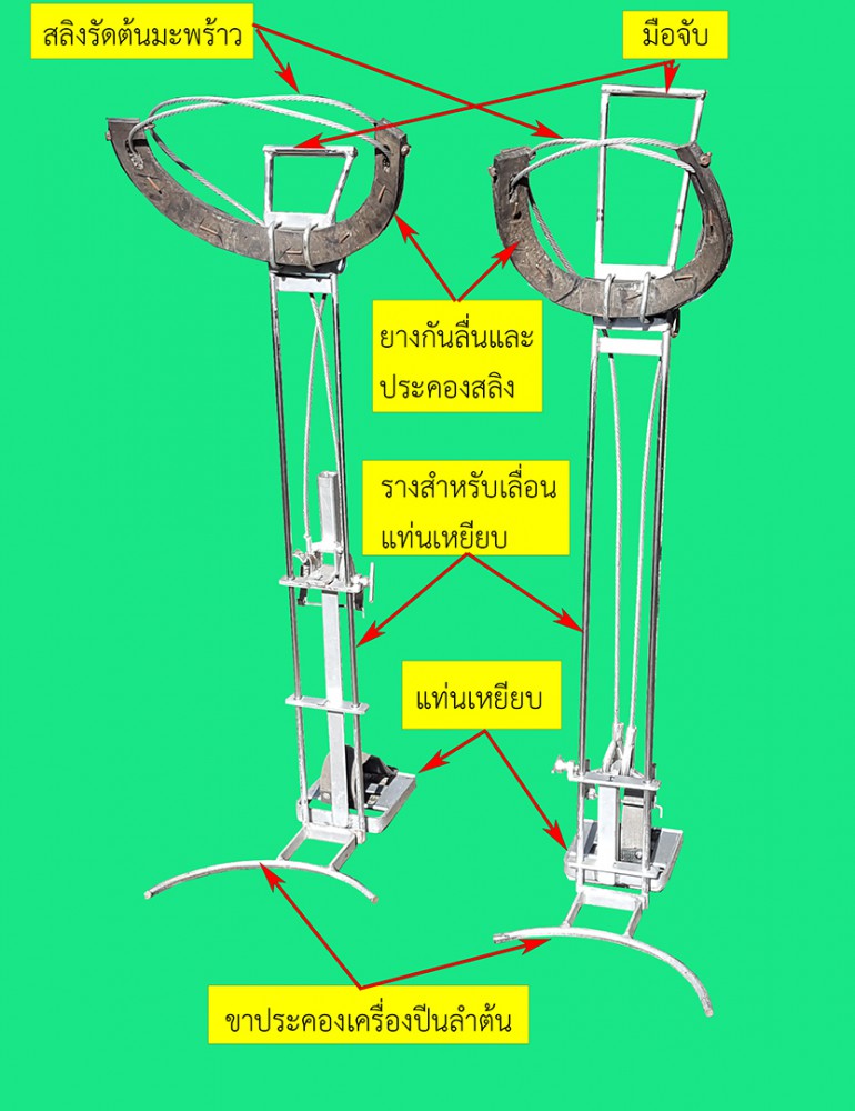 ด้านบนของขาเหยียบมีแผ่นยางกันกระแทก ทำหน้าที่กดรับขาไม่ให้หลุดออกจากเครื่องปีน ปลายสุดด้านบนมีมือจับ สำหรับใช้ยกลวดสลิงเวลาปีนต้นมะพร้าว ลวดสลิงขนาด 2 หุน ยาว 260 เซนติเมตรเมื่อคล้องทำเป็นบ่วงรอบโคนมะพร้าวต้องมีขนาดไม่น้อยกว่า 35 เซนติเมตรขึ้นไป ทำหน้าที่รัดต้นมะพร้าวและพยุงขาเหยียบให้เกาะเกี่ยวต้นมะพร้าวระหว่างที่ใช้มือจับยกขาเหยียบให้ค่อยขยับขึ้นไป