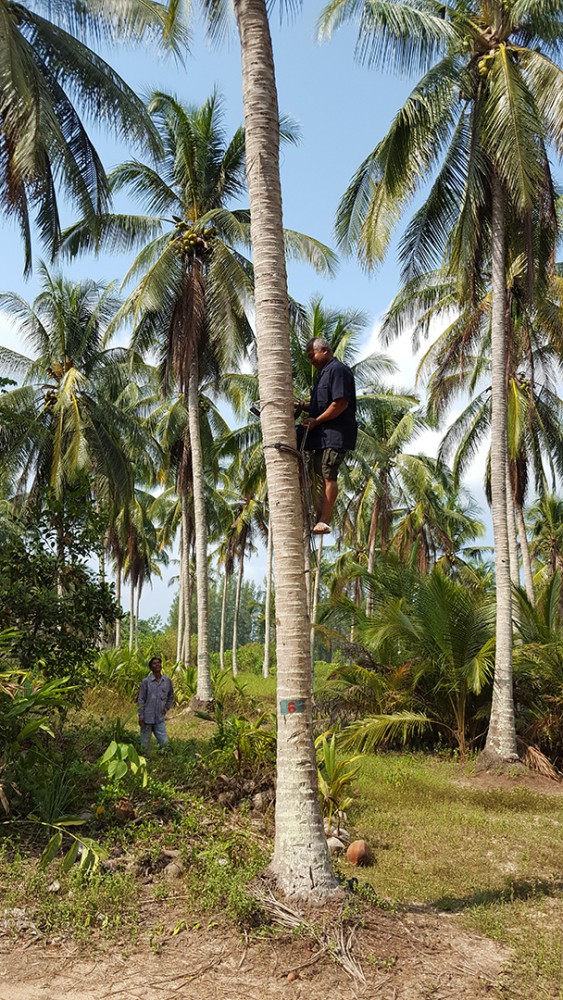 สถาบันวิจัยเกษตรวิศวกรรม กรมวิชาการเกษตร โดย นายสุภาษิต เสงี่ยมพงศ์ ได้วิจัยคิดค้นผลิตเครื่องปีนมะพร้าว โดยพัฒนาจากต้นแบบของประเทศอินเดีย เป็นอุปกรณ์ขาเหยียบไต่ต้นมะพร้าวขึ้นไป มีสองด้านซ้ายขวา แท่นเหยียบขนาด 14×15 เซนติเมตร ทำจากเหล็กเหนียว เชื่อมต่อกับเพลากลมที่ทำจากสแตนเลสยาว 90 เซนติเมตรเพื่อให้ไม่เป็นสนิม ด้านล่างของขาเหยียบทั้งสองข้างมีเหล็กโค้งยาว 34 เซนติเมตรทำหน้าที่โอบรอบโคนมะพร้าวเพื่อกดค้ำต้นมะพร้าวขณะที่ถ่ายน้ำหนักตัวลงไปเหยียบบนเครื่องปีน