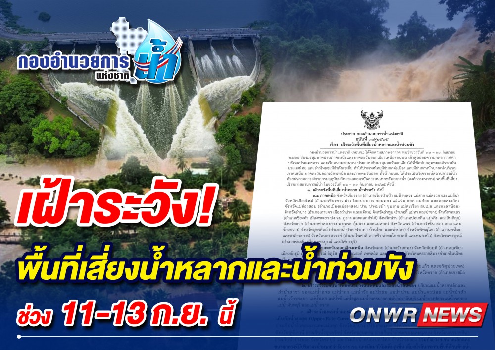 กองอำนวยการน้ำแห่งชาติ (กอนช.) ได้ติดตามสภาพอากาศ พบว่าช่วงวันที่ 11-13 กันยายน 2565 ร่องมรสุมพาดผ่านภาคเหนือและภาคตะวันออกเฉียงเหนือตอนบน เข้าสู่หย่อมความกดอากาศต่ำบริเวณประเทศลาว และเวียดนามตอนบน ประกอบกับมรสุมตะวันตกเฉียงใต้ที่พัดปกคลุมทะเลอันดามัน ประเทศไทย และอ่าวไทยจะมีกำลังแรงขึ้น ทำให้ประเทศไทยมีฝนตกต่อเนื่อง และมีฝนตกหนักบางแห่งบริเวณภาคเหนือ ภาคตะวันออกเฉียงเหนือ และภาคตะวันออก ทั้งนี้ กอนช. ได้ประเมินวิเคราะห์สถานการณ์น้ำ ด้วยฝนคาดการณ์จากกรมอุตุนิยมวิทยาและสถาบันสารสนเทศทรัพยากรน้ำ(องค์การมหาชน) พบพื้นที่เสี่ยงเฝ้าระวังสถานการณ์น้ำ ในช่วงวันที่ 11-13 กันยายน 2565 ดังนี้