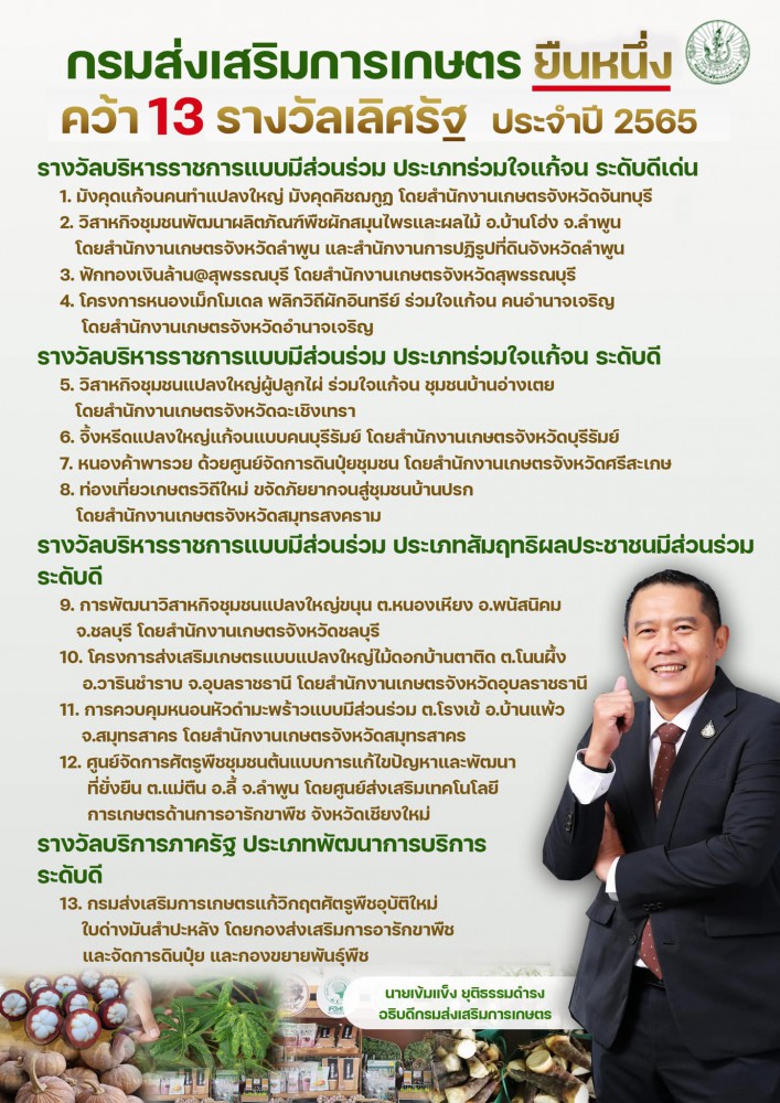 และ 2) รางวัลการบริหารราชการแบบมีส่วนร่วม ประเภทสัมฤทธิผลประชาชนมีส่วนร่วม ระดับดี จำนวน 4 รางวัล จากผลงาน การพัฒนาวิสาหกิจชุมชนแปลงใหญ่ขนุน ต.หนองเหียง อ.พนัสนิคม จ.ชลบุรี โดยสำนักงานเกษตรจังหวัดชลบุรี, โครงการส่งเสริมเกษตรแบบแปลงใหญ่ไม้ดอกบ้านตาติด ต.โนนผึ้ง อ.วารินชำราบ จ.อุบลราชธานี โดยสำนักงานเกษตรจังหวัดอุบลราชธานี, การควบคุมหนอนหัวดำมะพร้าวแบบมีส่วนร่วม ต.โรงเข้ อ.บ้านแพ้ว จ.สมุทรสาคร โดยสำนักงานเกษตรจังหวัดสมุทรสาคร และศูนย์จัดการศัตรูพืชชุมชนต้นแบบการแก้ไขปัญหาและพัฒนาที่ยั่งยืน ต.แม่ตืน อ.ลี้ จ.ลำพูน โดยศูนย์ส่งเสริมเทคโนโลยีการเกษตรด้านการอารักขาพืช จังหวัดเชียงใหม่ รวมทั้ง รางวัลบริการภาครัฐ ประเภทพัฒนาการบริการ ระดับดี อีกจำนวน 1 รางวัล จากผลงาน “กรมส่งเสริมการเกษตรแก้วิกฤตศัตรูพืชอุบัติใหม่ใบด่างมันสำปะหลัง” โดย กองส่งเสริมการอารักขาพืชและจัดการดินปุ๋ย และกองขยายพันธุ์พืช