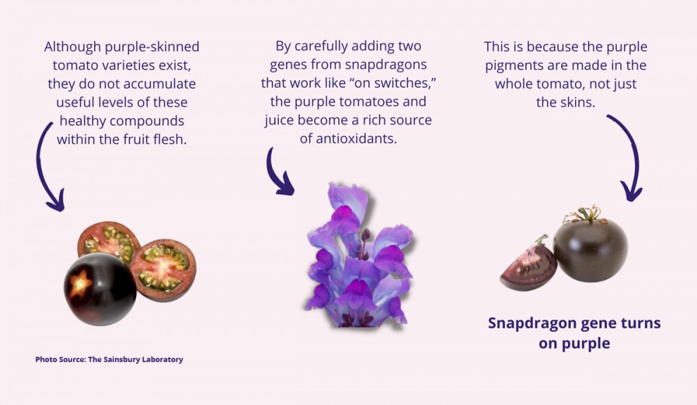 มะเขือเทศสีม่วง เป็นมะเขือเทศที่ถูกดัดแปลงเพื่อเปลี่ยนสีและเพิ่มคุณภาพทางโภชนาการ มะเขือเทศที่ปลูกอยู่ทั่วไป มียีนที่ควบคุมการผลิตแอนโธไซยานิน (anthocyaninsเป็นสารต้านอนุมูลอิสระ (antioxidant) ช่วยชะลอความเสื่อมของเซลล์) อยู่แล้ว แต่มะเขือเทศส่วนใหญ่ไม่ได้ “เปิดใช้งาน”