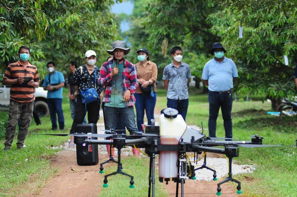 ในการฝึกอบรมครั้งนี้มีการสาธิตการฉีดพ่นด้วยโดรนเกษตร จากกลุ่มงานการใช้สารป้องกันกำจัดศัตรูพืช กรมวิชาการเกษตร บริษัท เอทีไอ เทคโนโลยีส์ จำกัด และบริษัท SATI PLATFORM จำกัด เพื่อดูการกระจายของละอองสารภายในทรงพุ่มทุเรียนอายุ 10 ปี ความสูง 7 เมตร ที่ผ่านการตัดแต่งทรงพุมให้โปร่งมาแล้ว 3 เดือน พบว่า ละอองสารสามารถกระจายเข้าสู่ภายในทรงพุ่มได้ทั่วถึงเป็นที่น่าพอใจ นอกจากเทคนิคด้านต่างๆ ที่กล่าวมาข้างต้นแล้ว ประสิทธิภาพของโดรนเกษตรก็มีส่วนสำคัญ ซึ่งเกษตรกรต้องพิจารณาเลือกให้เหมาะสมกับลักษณะงานที่จะใช้ในการฉีดพ่น