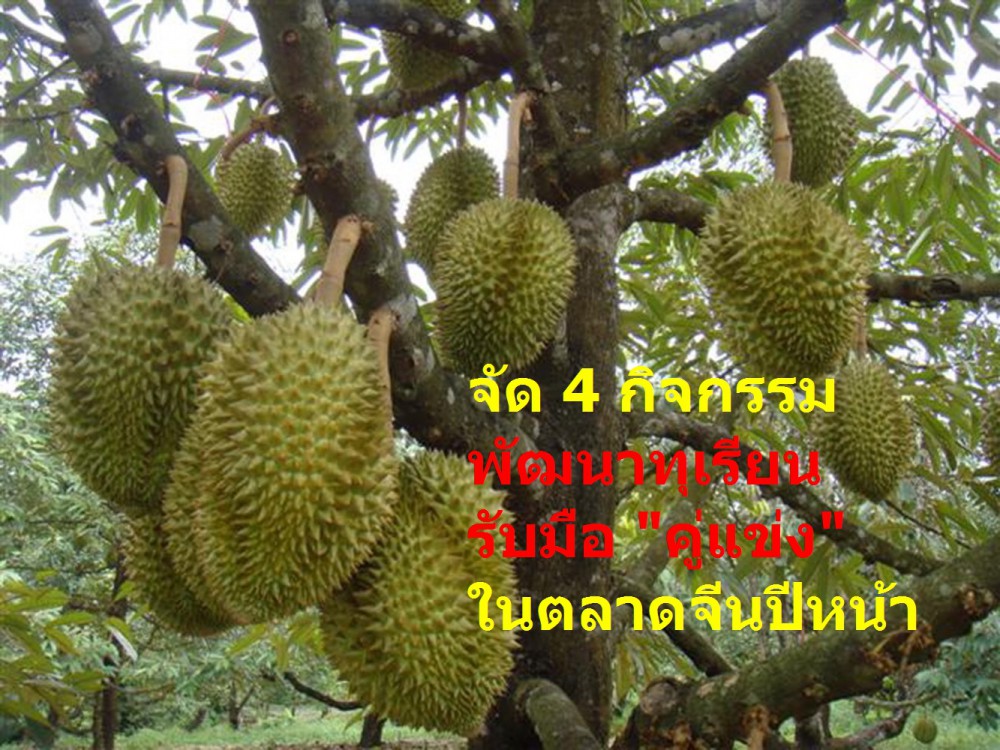 นายระพีภัทร์ จันทรศรีวงศ์ อธิบดีกรมวิชาการเกษตร กล่าวว่า ช่วง 8 เดือนแรกของปี 2565 ไทยส่งออกทุเรียนไปยังประเทศจี น มูลค่าเกือบแสนล้านบาท โดยมูลค่ารวมของการส่งออกผลไม้ ทั้งหมดแสนล้านบาท สร้างรายได้ให้กับประเทศเป็นอย่ างมาก แต่หลังจาก วันที่ 6 กันยายน 2565 จีนอนุญาตให้เวียดนามส่งออกทุ เรียนไปยังจีนได้ ผู้ประกอบการและเกษตรกรควรเร่ งปรับตัวเพื่อรับสภาพการแข่งขั นของตลาดทุเรียนจีนที่จะมีผู้ เล่นมากขึ้นในอนาคต การแข่งขันในการส่งออกทุเรี ยนไปยังตลาดต่างประเทศ ประเด็นที่สำคัญที่ต้องคำนึงถึ งคือ คุณภาพของทุเรียน ซึ่งทุเรียนที่มีคุณภาพดีย่ อมเป็นที่ต้องการของผู้บริโภค กรมวิชาการเกษตร มีคำแนะนำให้เกษตรกรรักษาคุ ณภาพในการผลิตทุเรียนคุ ณภาพในฤดูกาลถัดไป 4 กิจกรรมใหญ่ๆ ที่จะบำรุงรักษาต้นทุเรียนให้ ได้ผลผลิตที่ดี ในเขตพื้นที่ภาคตะวันออก ภายหลังการเก็บเกี่ยวทุเรียนดั งนี้