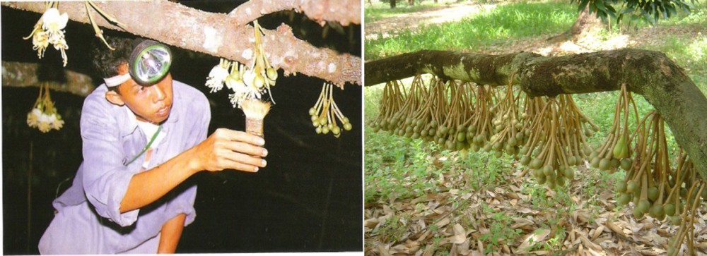 การจัดการเพื่อให้ทุเรี ยนออกดอกและติดผลดี (พ.ย-ธ.ค) แนะนำให้เกษตรกรใส่ปุ๋ยเคมี ทางดิน ก่อนสิ้นฤดูฝนประมาณ 1 เดือน งดการให้น้ำต่อเนื่องไม่น้อยกว่ า 10 วัน ทำให้ต้นทุเรียนเกิดสภาพเครียด เพื่อชักนำการออกดอก ควรมีการป้องกันโรคและแมลงที่ สำคัญ เช่น โรคดอกเน่า เพลี้ยไฟและไรแดง ในช่วงก่อนดอกบาน 1 สัปดาห์ ให้น้ำเพียง 1 ใน 3 ของการให้น้ำปกติ เพื่อช่วยให้มีการติดผลดีขึ้น การจัดการเพื่อเพิ่มปริมาณคุ ณภาพและผลผลิต (ม.ค-เม.ษ) เกษตรกรควรตัดแต่งผลอ่อน ที่มีรูปทรงบิดเบี้ยว ผลเล็ก และหนามแดงออก จำนวน 1-3 ครั้ง ตั้งแต่ผลอายุ 4-8 สัปดาห์ และ ให้ปุ๋ยหลังการตัดแต่งผลครั้งสุ ดท้าย เพื่อส่งเสริมการเจริญเติ บโตของผล และคุณภาพเนื้อ หลังจากนั้นให้น้ำอัตราปกติหลั งการติดผล 3 สัปดาห์ และลดการให้น้ำก่อนการเก็บเกี่ ยวผลผลิต 2 สัปดาห์ ควบคุมการแตกใบอ่อนระหว่างการพั ฒนาการของผล โดยพ่นปุ๋ยโปแตสเซียมไนเตรท (13-0-45) อัตรา 150-300 กรัม/น้ำ 20 ลิตร ที่ใบอ่อนและระยะหางปลา ควบคุมการป้องกันกำจั ดโรคและแมลงที่สำคัญได้แก่ โรคผลเน่า เพลี้ยแป้ง เพลี้ยหอย หนอนเจาะผล และหนอนเจาะเมล็ดทุเรียน