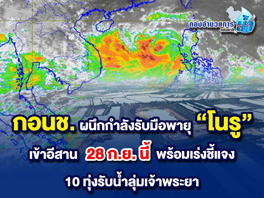 กอนช.ระดมกำลังศูนย์บริหารจัดการน้ำส่วนหน้าฯ รับมือพายุโซนร้อน “โนรู” คาดเคลื่อนตัวเข้าสู่ไทยทางภาคอีสาน 28 ก.ย.นี้ ขณะที่ภาคกลางเร่งจัดเวทีชี้แจงการใช้ 10 ทุ่งรับน้ำในพื้นที่ลุ่มเจ้าพระยาตอนล่าง ย้ำข้อห่วงใย “พลเอก ประวิตร” ต้องไม่ก่อให้เกิดผลกระทบหรือสร้างความเสียหายแก่ประชาชน