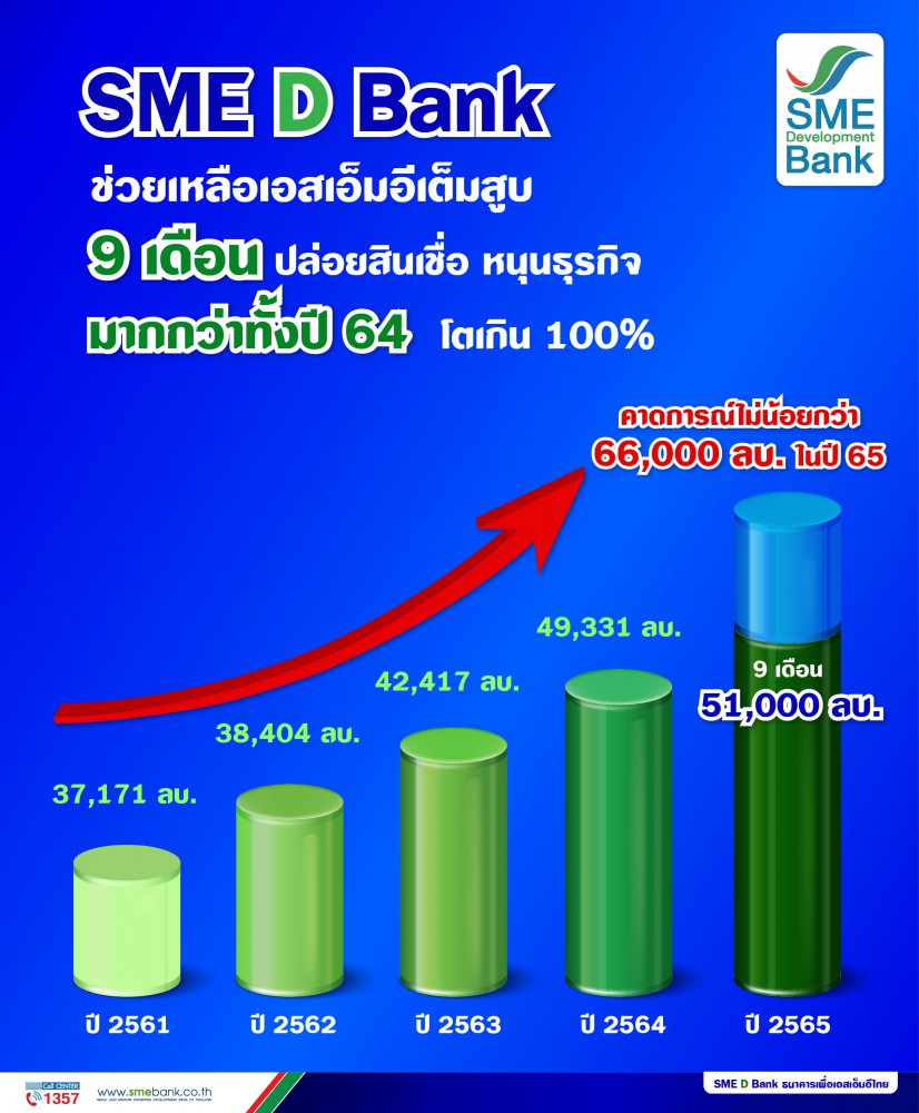 จขนาดกลางและขนาดย่อมแห่งประเทศไทย (ธพว.) หรือ SME D Bank เปิดเผยว่า จากความมุ่งมั่น ทุ่มเทของคณะกรรมการ ผู้บริหาร และพนักงาน SME D Bank ทุกคน ที่รวมพลังเป็นหนึ่งเดียวเพื่อช่วยเหลือเอสเอ็มอี ส่งผลให้การดำเนินงานในช่วง 9 เดือนของปีนี้ (ม.ค.-ก.ย.65) สามารถพาเอสเอ็มอีเข้าถึงแหล่งทุนรวมกว่า 51,000 ล้านบาท สูงกว่าตลอดทั้งปี 2564 ที่ผ่านมา ซึ่งมียอดรวม 49,331 ล้านบาท หรือเติบโตกว่า 100%