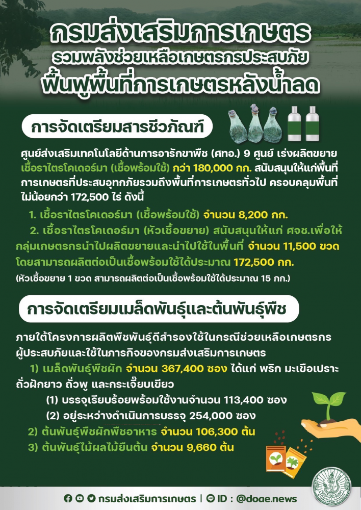 นายเข้มแข็ง กล่าวอีกว่า นอกจากการเร่งรัดให้สำนักงานเกษตรอำเภอและสำนักงานเกษตรจังหวัดสำรวจพื้นที่ที่ได้รับผลกระทบอย่างต่อเนื่องแล้ว การเตรียมความพร้อมเพื่อช่วยเหลือเกษตรกรของกรมส่งเสริมการเกษตรหลังเหตุอุทกภัยคลี่คลาย ได้มีมาตรการรองรับเรียบร้อยแล้ว ทั้งการเตรียมสำรองพืชพันธุ์ดี ทดแทนต้นพันธุ์ที่ได้รับความเสียหาย ประกอบด้วย เมล็ดพันธุ์พืชผัก 367,400 ซอง ต้นพันธุ์พืชผัก 106,300 ต้น และต้นพันธุ์ไม้ผลไม้ยืนต้น 9,660 ต้น