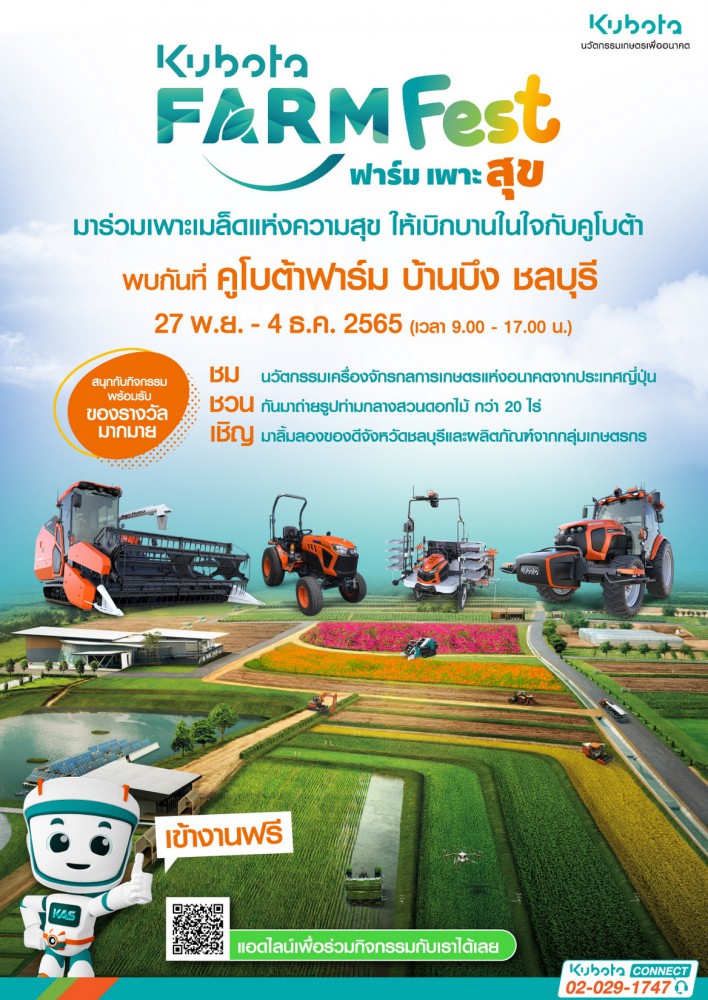 สยามคูโบต้า เชิญชวนสัมผัสบรรยากาศรับลมหนาว กับเฟสทิวัลแห่งโลกการเกษตรสุดยิ่งใหญ่แห่งปี “KUBOTA FARM FEST 2022 ฟาร์มเพาะสุข” ครั้งแรกในไทย พบกับการชูนวัตกรรมเกษตร Smart Farming แห่งอนาคต ต่อยอดการสร้างองค์ความรู้และแรงบันดาลใจสู่เส้นทางเกษตรสร้างรายได้เพื่อความยั่งยืน ในรูปแบบของการเปิดบ้าน “คูโบต้า ฟาร์ม”