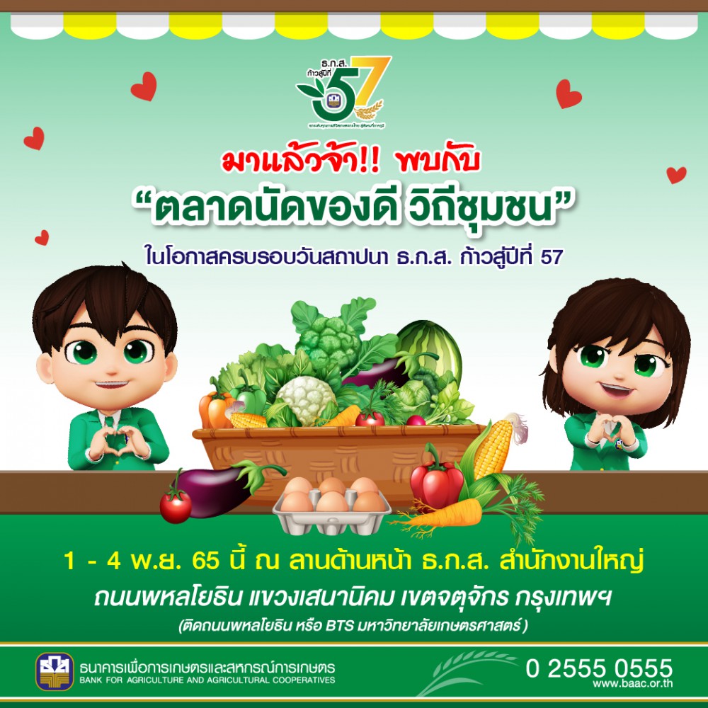ธ.ก.ส. ขนของดีเป็นสินค้าเกษตรและผลิตภัณฑ์ชุมชนจากเกษตรกรลูกค้า กว่า 60 ร้านค้า จัดตลาดนัดของดีวิถีชุมชน ในโอกาสครบรอบวันสถาปนา ธ.ก.ส. ก้าวสู่ปีที่ 57เพื่อเพิ่มช่องทางการจำหน่ายสินค้า สร้างอาชีพ สร้างรายได้แก่เกษตรกรลูกค้า วิสาหกิจชุมชนและผู้ประกอบการ SMEs เกษตร วันที่1 – 4 พฤศจิกายน 2565ณ บริเวณด้านหน้า ธ.ก.ส. สำนักงานใหญ่ กรุงเทพมหานคร