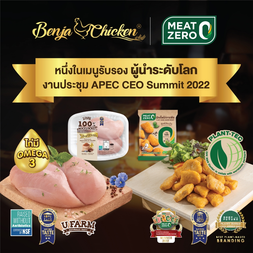บริษัท เจริญโภคภัณฑ์อาหาร จำกัด (มหาชน) หรือ ซีพีเอฟ เปิดเมนูพิเศษเสิร์ฟงานเลี้ยงอาหารค่ำการประชุมผู้นำภาคเอกชนของเอเปค หรือ APEC CEO Summit Reception 2022 โดยนำสองผลิตภัณฑ์ยั่งยืน ได้แก่ เนื้อจากพืช Meat Zero และ ไก่เบญจา แบรนด์ U FARM ซึ่งมีห่วงโซ่การผลิตภายใต้แนวคิด BCG โมเดล ให้ผู้นำระดับโลกได้ลิ้มลองความอร่อย ตอกย้ำคุณภาพอาหารที่ลดการปล่อยก๊าซเรือนกระจก ช่วยโลกยั่งยืน