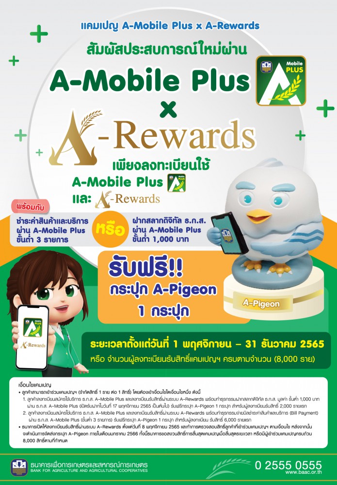 ธนาคารเพื่อการเกษตรและสหกรณ์การเกษตร (ธ.ก.ส.) จัดแคมเปญ A-Mobile Plus x A-Rewards สำหรับลูกค้าที่ใช้งานแอปพลิเคชัน A-Mobile Plus เพียงลงทะเบียนเปิดใช้งานการสะสมแต้มผ่าน A-Rewards พร้อมฝากสลากดิจิทัล ธ.ก.ส. จำนวน 1,000 บาทขึ้นไป 2,000 ท่านแรก หรือจ่ายบิลชำระค่าสินค้าและบริการ (Bill Payment) 3 รายการขึ้นไป ผ่านแอปพลิเคชัน A-Mobile Plus