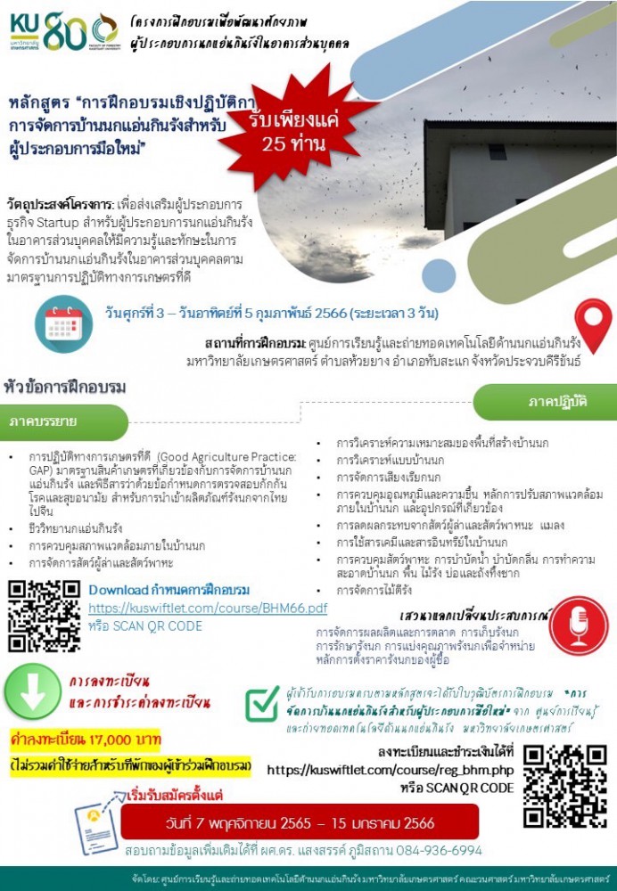 หลักสูตรที่ 2 การฝึกอบรมเชิงปฏิบัติการ “การจัดการบ้านนกแอ่นกินรังสำหรับผู้ประกอบการมือใหม่” สามารถลงทะเบียนและชำระเงินค่าลงทะเบียน 17,000 บาท (ไม่รวมค่าใช้จ่ายสำหรับที่พักและค่าเดินทางของผู้เข้าร่วมฝึกอบรม) ได้ที่ https://kuswiftlet.com/course/reg_bhm.php โดยหลักสูตรนี้เปิดรับสมัครจำนวนจำกัดเพียง 25 ท่านเท่านั้น สมัครได้ตั้งแต่บัดนี้จนถึงวันที่ 15 มกราคม พ.ศ.2566 กิจกรรมจะจัดขึ้นใน วันศุกร์ที่ 3 – วันอาทิตย์ที่ 5 กุมภาพันธ์ พ.ศ. 2566 (ระยะเวลา 3 วัน) ณ สถานฝึกอบรม ศูนย์การเรียนรู้ และถ่ายทอดเทคโนโลยีด้านนกแอ่นกินรัง มหาวิทยาลัยเกษตรศาสตร์ ตำบลห้วยยาง อำเภอทับสะแก จังหวัดประจวบคีรีขันธ์