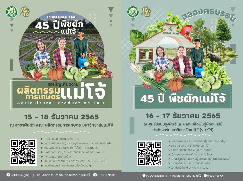 สาขาพืชผัก คณะผลิตกรรมการเกษตร มหาวิทยาลัยแม่โจ้ จัดงานฉลองครบรอบ “45 ปี พืชผักแม่โจ้” โชว์องค์ความรู้และนวัตกรรมทางด้านพืชผัก ทั้งด้านวิชาการและงาน Field day เปิดตัวบริษัท First Organic Seed บริษัทจำหน่ายเมล็ดพันธุ์ผักอินทรีย์แห่งแรกของประเทศไทย พร้อมกิจกรรมมากมายตลอดงาน ระหว่างวันที่ 15-18 ธันวาคม 2565 ณ พื้นที่ฟาร์มมหาวิทยาลัย และ สาขาพืชผัก คณะผลิตกรรมการเกษตร มหาวิทยาลัยแม่โจ้ จ.เชียงใหม่