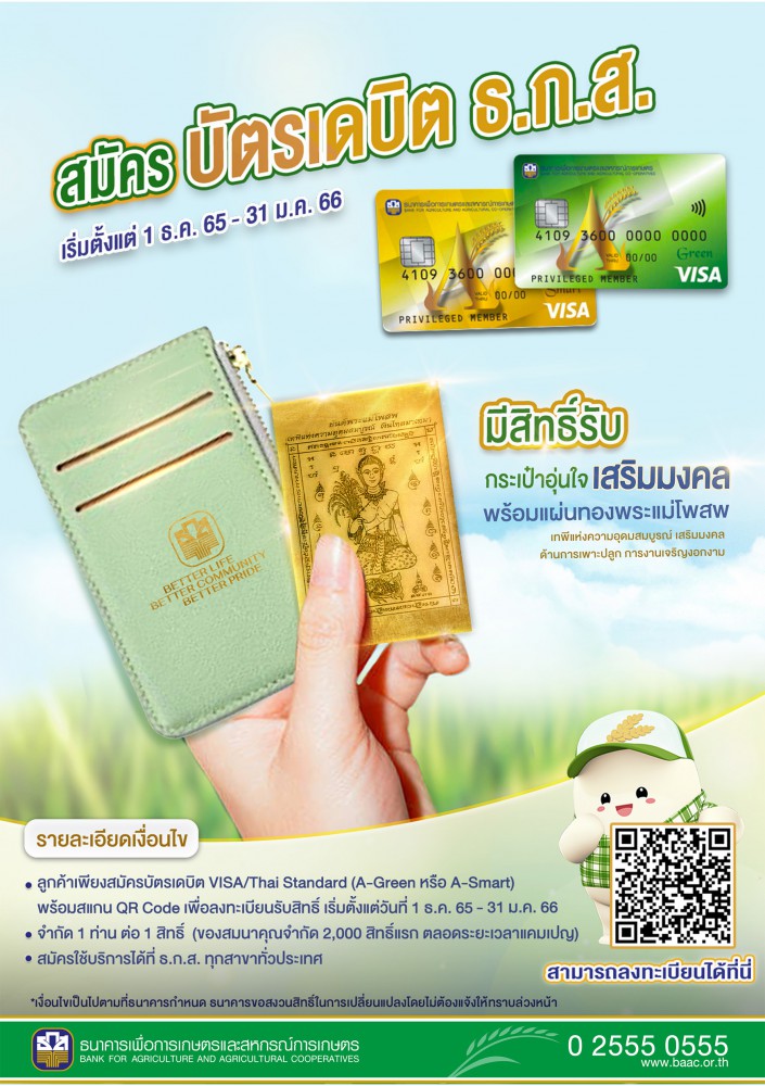 ธนาคารเพื่อการเกษตรและสหกรณ์การเกษตร (ธ.ก.ส.) จัดแคมเปญอุ่นใจเสริมมงคล สำหรับลูกค้าที่สมัครบัตรเดบิต ธ.ก.ส. (บัตรเดบิต A-Green และ A-Smart) พร้อมสแกน QR Code เพื่อลงทะเบียนรับสิทธิ์ รับเลย ! กระเป๋าอุ่นใจเสริมมงคล พร้อมแผ่นทองพระแม่โพสพ (เทพีแห่งความอุดมสมบูรณ์ เสริมมงคล ด้านการเพาะปลูก การงานเจริญงอกงาม) 2,000 ท่านแรก