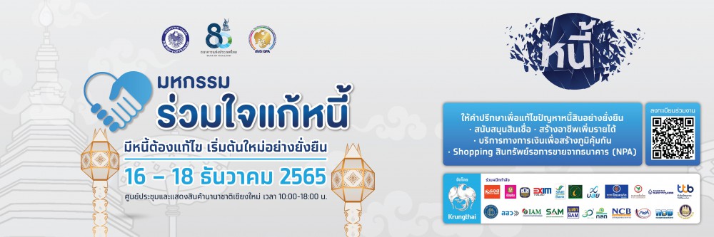 ทั้งนี้ ธ.ก.ส. ขอเชิญชวนลูกหนี้ที่ประสงค์รับความช่วยเหลือและประชาชนทั่วไปที่สนใจร่วมงาน “มหกรรมร่วมใจแก้หนี้ มีหนี้ต้องแก้ไข เริ่มต้นใหม่อย่างยั่งยืน” ครั้งที่ 3 ระหว่างวันที่ 16 – 18 ธันวาคม 2565 ณ ศูนย์ประชุมและแสดงสินค้านานาชาติ จังหวัดเชียงใหม่ หรือลงทะเบียนแจ้งความประสงค์ขอแก้ไขหนี้ออนไลน์ผ่าน https://www.bot.or.th/DebtFair/ ตั้งแต่บัดนี้จนถึง 31 มกราคม 2566