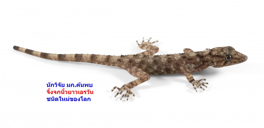 นักวิจัย ม.เกษตรศาสตร์ ค้นพบจิ้งจกนิ้วยาวเอราวัณ (Cnemaspis auriventralis) อาศัยในพื้นที่อุทยานแห่งชาติเอราวัณ อำเภอศรีสวัสดิ์ จังหวัดกาญจนบุรี ถือเป็นจิ้งจกนิ้วยาวชนิดใหม่ของโลก จัดอยู่ในกลุ่มจิ้งจกนิ้วยาวสยาม Cnemaspis siamensis group ปัจจุบันมีสมาชิกประมาณ 13 ชนิด มีลักษณะเด่นสีเหลืองทั่วบริเวณฝั่งด้านท้อง ตั้งแต่ส่วนหัว ลำตัว และหาง ชอบอยู่บริเวณพื้นที่เขาหินปูนของทิวเขาตะนาวศรี