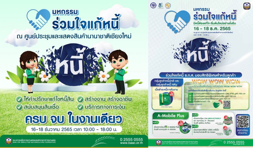 โอกาสนี้ ขอเชิญชวนผู้ที่มีปัญหาภาระหนี้สิน ผู้ประกอบการและประชาชนทั่วไปเข้าร่วมงานมหกรรมร่วมใจแก้หนี้สัญจร “มีหนี้ต้องแก้ไข เริ่มต้นใหม่อย่างยั่งยืน” ครั้งที่ 3 ตั้งแต่วันนี้จนถึงวันที่ 18 ธันวาคม 2565 ณ ศูนย์ประชุมและแสดงสินค้านานาชาติเชียงใหม่