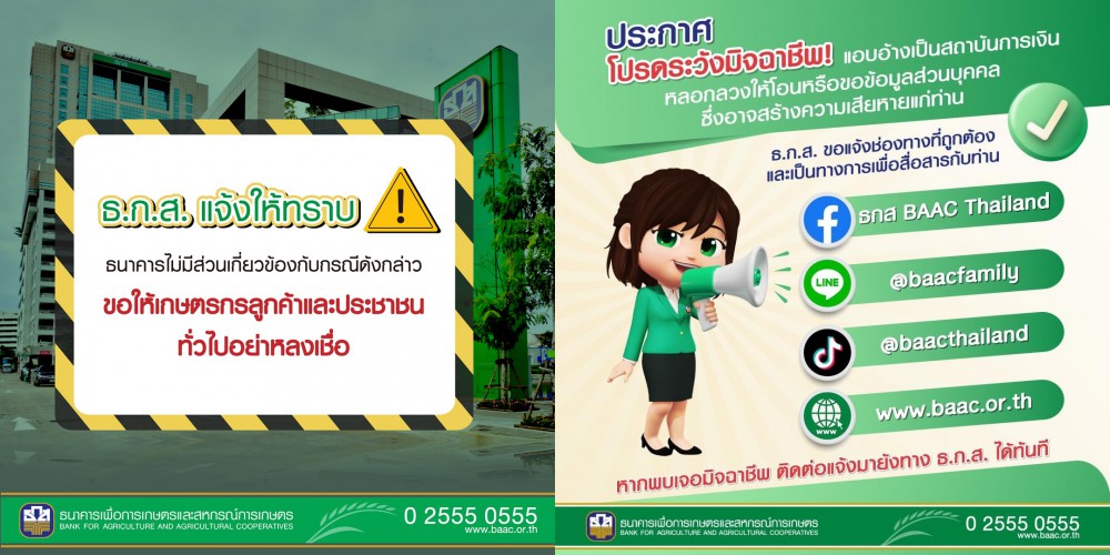 ธ.ก.ส. เตือนระวัง!! มีมิจฉาชีพการแอบอ้างโดยใช้ตราสัญลักษณ์และชื่อธนาคารทำการปล่อยเงินกู้นอกระบบผ่านทาง SMS ยืนยันไม่มีส่วนเกี่ยวข้องกับการกระทำดังกล่าวและไม่มีนโยบายปล่อยเงินกู้ผ่านทาง SMS และสื่อสังคมออนไลน์แต่อย่างใด ชี้ช่องทางสื่อสารหลักที่เป็นทางการของธนาคารคือ เว็บไซต์ www.baac.or.th Facebook Page “ธกส BAAC Thailand” และ Line Official Account : @baacfamily เพื่อแจ้งข่าวสารผลิตภัณฑ์ บริการและกิจกรรมต่าง ๆ กับลูกค้าเท่านั้น หากพบเห็นการแอบอ้างต่าง ๆ สามารถแจ้งได้ที่ Call Center 02 555 0555