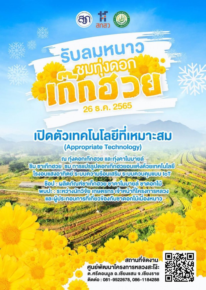 สวก. ผนึกกำลัง โครงการหลวง ส่วนราชการจังหวัดเชียงราย และมหาวิทยาลัยแม่โจ้ จัดงานเปิดตัวเทคโนโลยีที่เหมาะสม “รับลมหนาวชมทุ่งดอกเก๊กฮวย”ณ ศูนย์พัฒนาโครงการหลวงสะโง๊ะ อำเภอเชียงแสน จังหวัดเชียงราย โชว์ให้เห็นการแปรรูปดอกเก๊กฮวยอบแห้งด้วยเทคโนโลยีโรงอบแสงอาทิตย์ระบบความร้อนเสริม ระบบควบคุมแบบ IoT ชิม ช้อปผลิตภัณฑ์ชาเก๊กฮวย ชาคาโมมายล์ ชาดอกไม้ และการบรรยายพิเศษจากนักวิจัย เกษตรกร และผู้ประกอบการที่เกี่ยวข้องกับชาดอกไม้เมืองหนาว เพื่อสร้างโอกาสในการต่อยอดทางธุรกิจ และสร้างรายได้ให้แก่ชุมชน