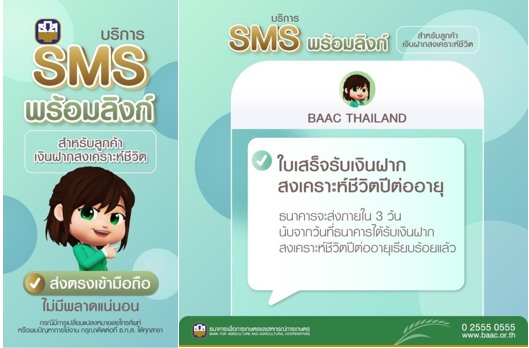 ธนาคารเพื่อการเกษตรและสหกรณ์การเกษตร (ธ.ก.ส.) เปิดตัวบริการ SMS แจ้งยอดชำระและใบเสร็จรับเงินเต็มรูปแบบให้กับลูกค้าเงินฝากสงเคราะห์ ทั้ง ธกส มอบรัก 1/1 ธกส รักคุณ ธกส เพิ่มรัก 2 และ ธกส ทวีรัก 99 เพื่ออำนวยความสะดวกให้ลูกค้าเข้าถึงบริการทางการเงินได้สะดวกมากยิ่งขึ้น โดยธนาคารจะส่งใบแจ้งยอดการส่งเงินฝากสงเคราะห์ล่วงหน้าก่อนวันครบกำหนดชำระ 7 วัน ให้กับลูกค้าตามหมายเลขโทรศัพท์ที่บันทึกไว้ในระบบเงินฝากสงเคราะห์ชีวิต (BAACLife)