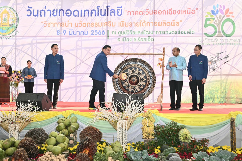 นางสาวมนัญญา ไทยเศรษฐ์ รัฐมนตรีช่วยว่าการกระทรวงเกษตรและสหกรณ์ มอบหมายให้ นายระพีภัทร์ จันทรศรีวงศ์ อธิบดีกรมวิชาการเกษตร เป็นประธานในพิธีเปิดงาน “วันถ่ายทอดเทคโนโลยีการผลิตพืชภาคตะวันออกเฉียงเหนือตอนบน ”ภายใต้แนวคิด “วิชาการนำ นวัตกรรมเสริม เพิ่มรายได้การผลิตพืช” ซึ่งจัดขึ้นระหว่างวันที่ 8 – 9 มีนาคม 2566 พร้อมมอบประกาศนียบัตรผู้ผ่านการฝึกอบรมหลักสูตรการพ่นวัตถุอันตรายทางการเกษตรด้วยอากาศยาน ณ ศูนย์วิจัยและพัฒนาการเกษตรร้อยเอ็ด อำเภอเมือง จังหวัดร้อยเอ็ด โดยกรมวิชาการเกษตรร่วมกับสมาคมการค้านวัตกรรมเพื่อการเกษตรไทย (TAITA) สำนักงานการบินพลเรือนแห่งประเทศไทย สำนักงานคณะกรรมการกระจายเสียง กิจการโทรทัศน์ และกิจการโทรคมนาคมแห่งชาติ และภาคเอกชน Kick Off หลักสูตรแรกในประเทศไทย จัดอบรมหลักสูตรการพ่นวัตถุอันตรายทางการเกษตรด้วยอากาศยาน (โดรน)