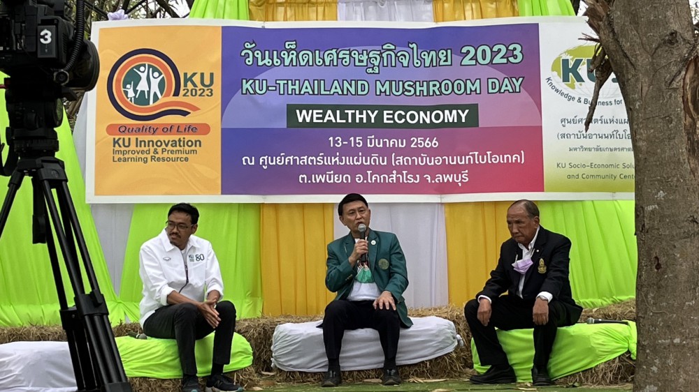 ผศ.ดร.นิคม แหลมสัก รองอธิการบดีฝ่ายนวัตกรรมและกิจการเพื่อสังคม มหาวิทยาลัยเกษตรศาสตร์ กล่าวว่า มหาวิทยาลัยเกษตรศาสตร์ มีการพัฒนารูปแบบการเรียนรู้ตลอดชีวิต (KU-Lifelong Learning Model)เชื่อมโยงประเด็นยุทธศาสตร์ชาติกับบทบาทของมหาวิทยาลัย และบูรณาการความร่วมมือกับเครือข่ายเพื่อยกระดับความรู้ นวัตกรรม ผ่านสินค้าและบริการคุณภาพ ควบคู่กับการพัฒนาทรัพยากรมนุษย์ โดยมอบให้สำนักส่งเสริมและฝึกอบรม ขับเคลื่อนโครงการนำร่องซึ่งเป็นส่วนหนึ่งของกรอบแนวคิด KUniverse ที่นำองค์ความรู้มาบูรณาการร่วมกัน นำสินค้าและบริการคุณภาพเป็นตัวนำและโยงมาสู่การเรียนการสอน ประกอบกับปีนี้เป็นปีของการเฉลิมฉลองครบรอบ 80 ปีของมหาวิทยาลัยเกษตรศาสตร์ จึงได้ร่วมกับภาคีเครือข่ายจัดกิจกรรม“วันเห็ดเศรษฐกิจไทย 2023”บริบทใหม่ :- เห็ดเศรษฐกิจฐานนวัตกรรมไทย ณ ศูนย์ศาสตร์แห่งแผ่นดิน ฟาร์มอานนท์ไบโอเทค ต.เพนียด อ.โคกสำโรง จ.ลพบุรี