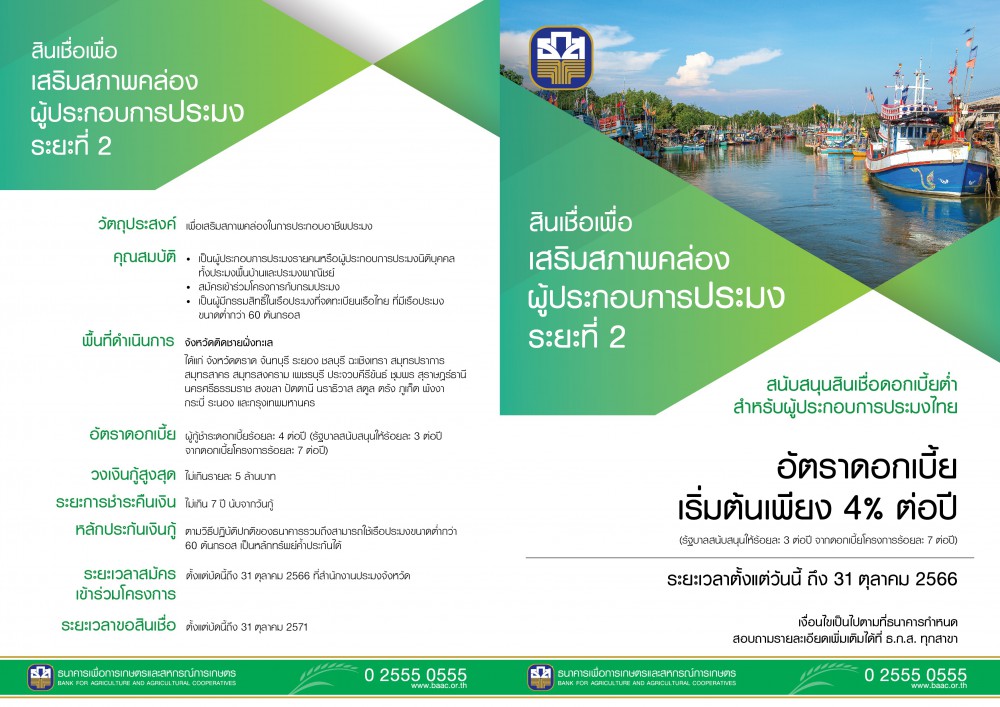ธ.ก.ส. จัดสินเชื่อเสริมสภาพคล่องผู้ประกอบการประมง ระยะที่ 2 วงเงิน 3,000 ล้านบาท ให้ผู้ประกอบการประมงในพื้นที่ 23 จังหวัดชายฝั่งทะเล ได้เข้าถึงแหล่งเงินทุนอัตราดอกเบี้ยผ่อนปรน เพื่อเป็นค่าใช้จ่ายหมุนเวียน และค่าลงทุนในการปรับปรุงอุปกรณ์การทำประมงให้เทียบเท่ามาตรฐานสากล เสริมสร้างความมั่นคงทางทรัพยากรทางทะเลและอาหารอย่างยั่งยืน โดยรัฐบาลช่วยรับภาระในการชดเชยดอกเบี้ยร้อยละ 3 ต่อปี และผู้กู้จ่ายดอกเบี้ยเพียงร้อยละ 4 ต่อปี สำหรับผู้ที่สนใจ ยื่นความประสงค์ได้ที่สำนักงานประมงจังหวัด ตั้งแต่วันนี้จนถึง 31 ตุลาคม 2566