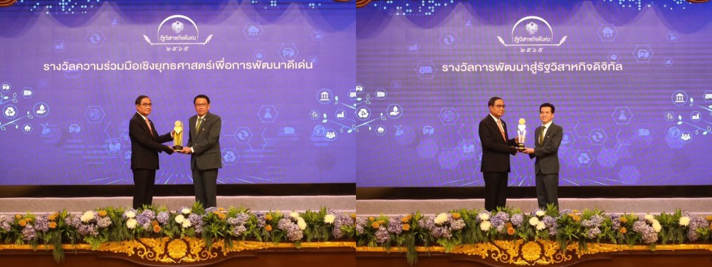 วันที่ 24 มีนาคม 2566) พลเอกประยุทธ์ จันทร์โอชา นายกรัฐมนตรี เป็นประธานในการมอบรางวัลรัฐวิสาหกิจดีเด่น ประจำปี 2565 จัดโดยสำนักงานคณะกรรมการนโยบายรัฐวิสาหกิจ (สคร.) กระทรวงการคลัง ภายใต้แนวคิด “รัฐวิสาหกิจไทยขับเคลื่อนเศรษฐกิจใหม่ สู่การเติบโตอย่างยั่งยืน (GROW GREEN BALANCE)” โดยมีนายจรูญเดช เจนจรัสสกุล กรรมการธนาคารเพื่อการเกษตรและสหกรณ์การเกษตร (ธ.ก.ส.) และนายธนารัตน์ งามวลัยรัตน์ ผู้จัดการ ธ.ก.ส. เข้ารับรางวัล จำนวน 2 รางวัล ได้แก่ รางวัลการพัฒนาสู่รัฐวิสาหกิจดิจิทัล และรางวัลความร่วมมือเชิงยุทธศาสตร์เพื่อการพัฒนาดีเด่น ณ ตึกสันติไมตรี ทำเนียบรัฐบาล กรุงเทพฯ