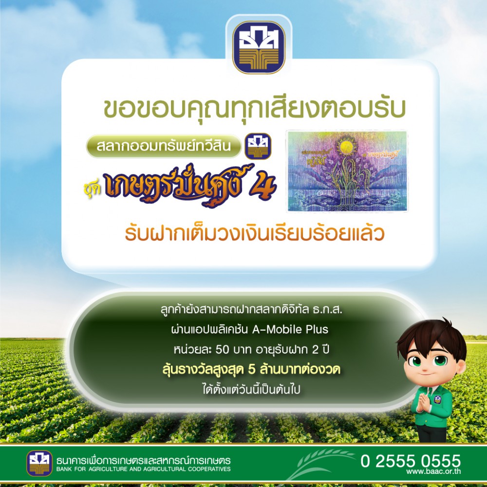 ธ.ก.ส. เฮ! ยอดฝากสลากออมทรัพย์ทวีสิน ชุดเกษตรมั่นคง 4 มีผู้จองและฝากผ่านแอปพลิเคชัน ธ.ก.ส. A-Mobile A-Mobile Plus และที่สาขาทั่วประเทศ ครบเต็มวงเงิน 100,000 ล้านบาทในเวลาอันรวดเร็ว สำหรับผู้ที่มีความประสงค์ฝากสลากออมทรัพย์ ธ.ก.ส. สามารถฝากและลุ้นโชคผ่านสลากดิจิทัล ธ.ก.ส. ที่ให้ผลตอบแทนเป็นดอกเบี้ยและรางวัล มีความสะดวกและตอบโจทย์คนรุ่นใหม่ ในราคาหน่วยละ 50 บาท ลุ้นรางวัลที่ 1 มูลค่า 5 ล้านบาท และรางวัลอื่น ๆ กว่า 15.9 ล้านบาทต่อเดือน