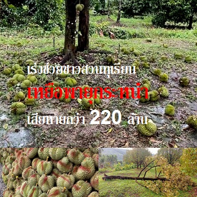 พิษพายุกระหน่ำสวนทุเรียนในพื้นที่ 2 จังหวัด “จันทบุรี-ตาด” เสียหายกว่า 220 ล้านบาท อธิบดีกรมวิชาการเกษตร หวั่นแอบลักลอบปะปนทุเรียนส่งออก กำชับหน่วยงานที่เกี่ยวข้องเข้มงวดในการตรวจสอบและให้พ่นสีทำตำหนิเป็นสัญลักษณ์ พร้อมเร่งช่วยเหลือชาวสวนที่ได้รับผลกระทบตามระเบียบราชการ ล่าสุดมีผู้ประกอบการรับซื้อเพื่อนำไปแปรรูปแล้วในราคา กก.ละ 5-25 บาท